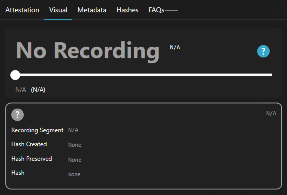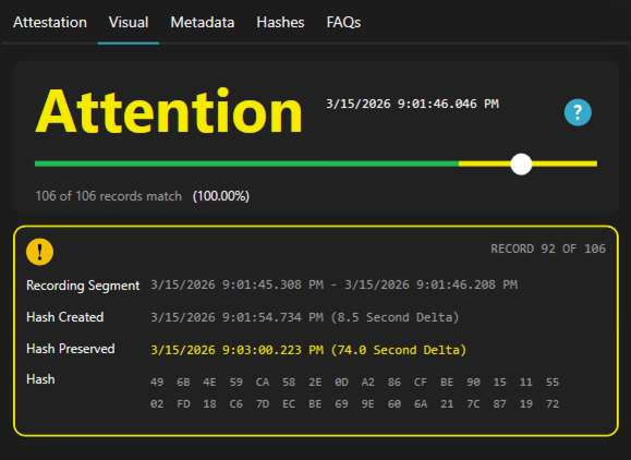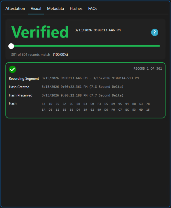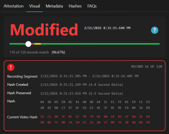 - Visual: This section displays validation status across the video and compares cryptographic hashes preserved during the original recording with hashes from the current video for each segment.