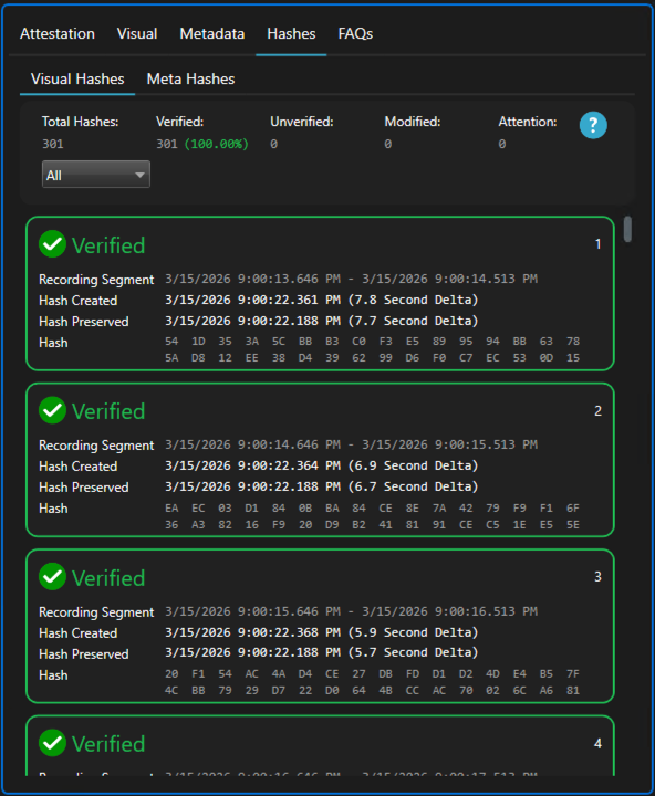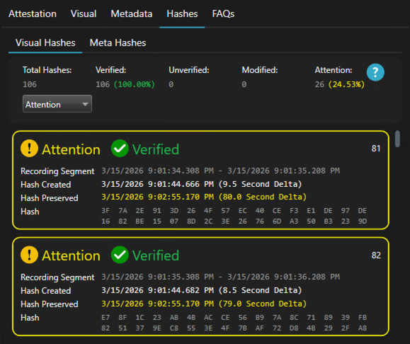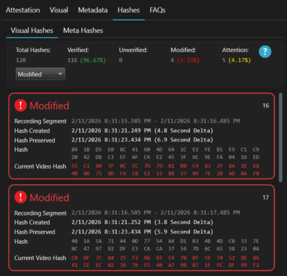 - Hashes: This section lets you review hash values for each video segment. Use filters for Verified, Modified, Unverified, and Attention to quickly find segments by status.