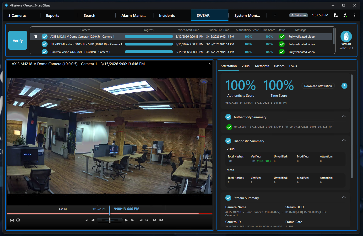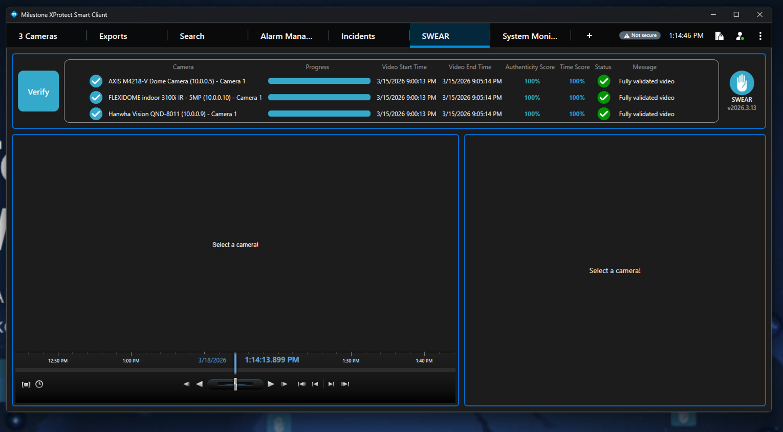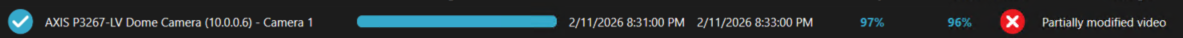 Notes: After the progress bar finishes, verification results appear for each camera. These results indicate the authenticity status across the selected video interval.