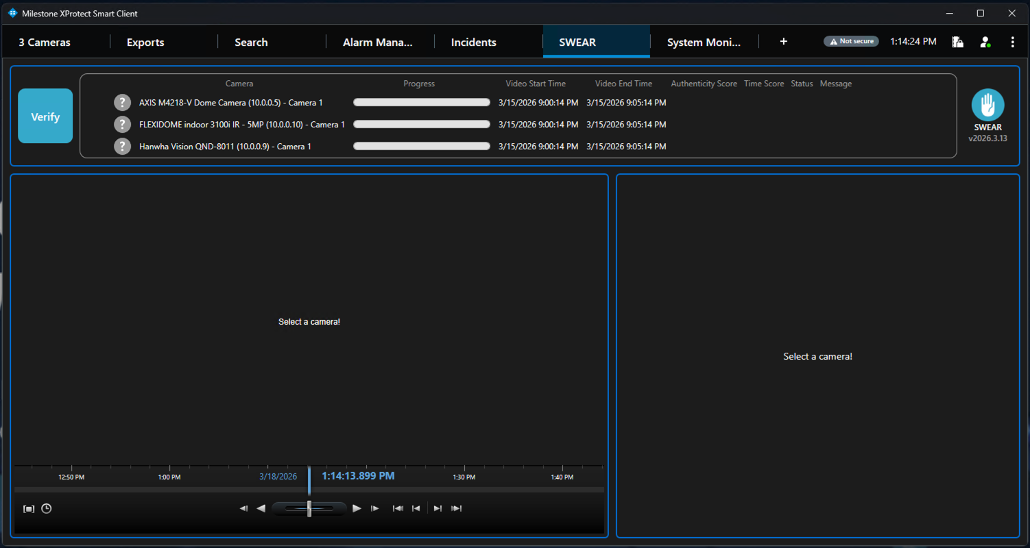 - SWEAR Milestone Plugin will be installed so you can verify video authenticity in Milestone Smart Client and SWEAR protected exports.