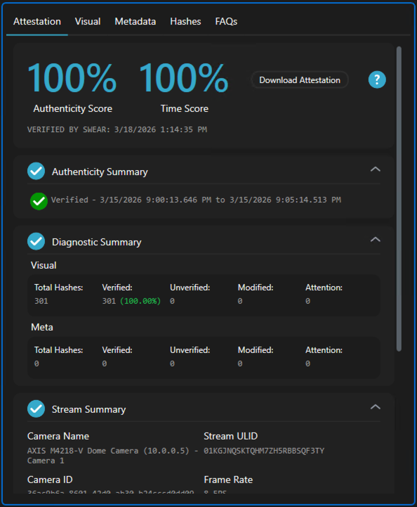 Attestation: A summary of the Authenticity Score and Time Score, with a link to create and download a PDF attestation report.