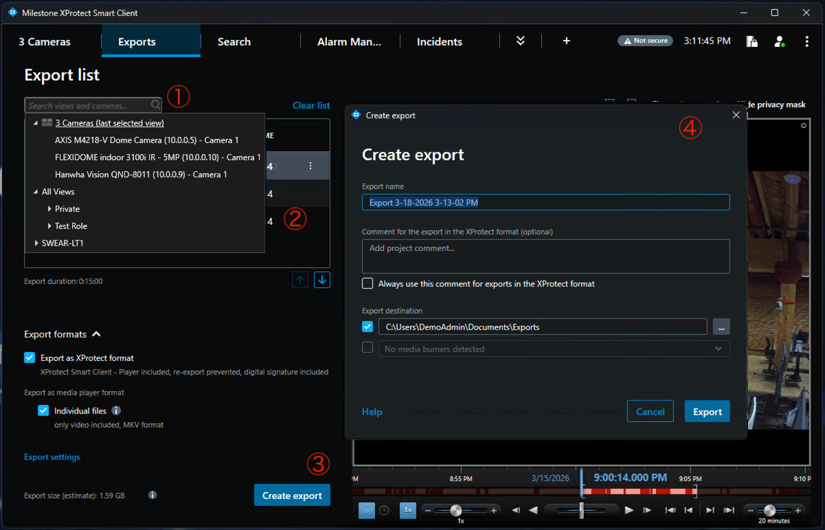 - When you have selected all cameras, select "Create Export".